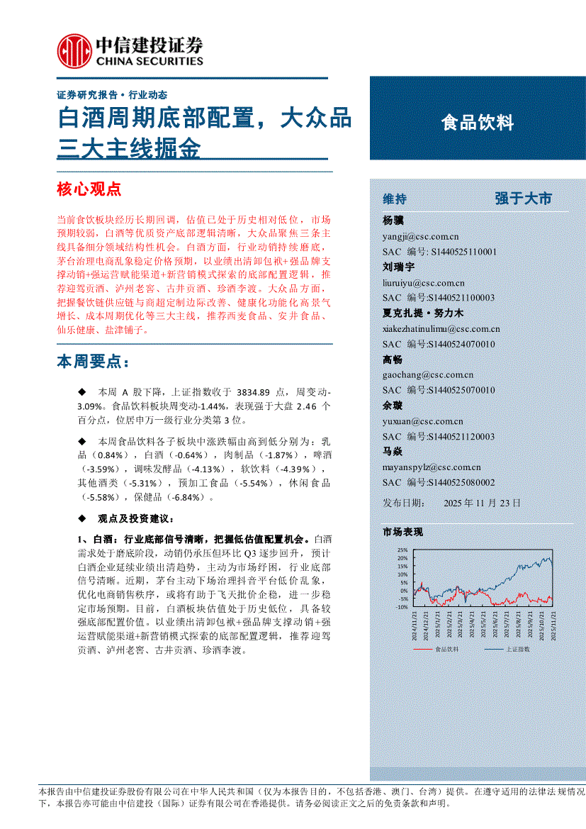 当前食饮板块履历持久回调,估值已处于汗青相对低位,市场预期较弱,白酒等优良资产底部逻辑清晰,公共品聚焦从线具备细分范畴布局性机遇。白酒方面,行业动销持续磨底,茅台管理电商乱象不变价钱预期,以业绩出清卸负担+强品牌支持动销+强运营赋能渠道+新营销模式摸索的底部设置装备摆设逻辑,保举送驾贡酒、泸州老窖、古井贡酒、珍酒李渡。(慧博投研资讯)公共品方面,把握餐饮链供应链取商超定制边际改善、健康化功能化高景气增加、成本周期优化等三大从线,保举西麦食物、安井食物、盐津铺子。本周要点:本周A股下降,上证指数收于3834。89点,周变更3。09%。食物饮料板块周变更-1。44%,表示强于大盘2。46个百分点,位居申万一级行业分类第3位。本周食物饮料各子板块中涨跌幅由高到低别离为:乳品(0。84%),白酒(-0。64%),肉成品(-1。87%),啤酒(-3。59%),调味发酵品(-4。13%),软饮料(-4。39%),其他酒类(-5。31%),预加工食物(-5。54%),休闲食物(-5。58%),保健品(-6。84%)。1、白酒:行业底部信号清晰,把握低估值设置装备摆设机遇。白酒需求处于磨底阶段,估计白酒企业延续业绩出清趋向,自动为市场纾困,行业底部信号清晰。近期,茅台自动管理抖音平台低价乱象,优化电商发卖次序,或将有帮于批价企稳,进一步不变市场预期。目前,白酒板块估值处于汗青低位,具备较强底部设置装备摆设价值。以业绩出清卸负担+强品牌支持动销+强运营赋能渠道+新营销模式摸索的底部设置装备摆设逻辑,保举送驾贡酒、泸州老窖、古井贡酒、珍酒李渡。2、公共品:聚焦从线,把握细分范畴布局性机遇。1)餐饮链供应链取商超定制。进入四时度保守旺季,餐饮供应链逐步削减价钱合作性收入,且渠道库存负担较轻,合作优化,叠加部门企业商超定制产物进入放量期,估计需求逐渐改善。十月稻田。2)健康化赛道取功能化大单品。西麦受益于“燕麦+”健康化赛道高景气取新零售渠道驱动业绩增加,燕麦粒采购价下行利润弹性。仙乐健康国内收入持续改善,新消费客户表示亮眼,估计BF年内剥离PC营业,关税冲击落地,看好26年利润弹性。保举西麦食物、仙乐健康、盐津铺子。3)成本周期改善。原奶周期拐点将至,利好龙头液奶需求修复,品类布局性增加机遇凸显。酵母糖蜜新榨季估计采购成本下降,保举伊利股份、安琪酵母。此前抖音平台低价茅台乱象凸起,本周该环境显著改善。经抖音对相关店肆研判调整及价钱管理后,17日平台正在售的53度茅台价钱根基不变正在1700元及以上,止住低价颓势,虽仍有少量从播兜销低价茅台,但多量违规低价链接被处置,此举必然程度上缓解了对线下正轨经销商的冲击,利于稳住茅台批价取渠道决心。瞻望将来,国内经济无望逐步企稳回升,以白酒为代表的顺周期财产无望从头步入高增加通道。沉点公司批价:茅台整箱、散瓶价钱别离为1665元/瓶、1655元/瓶,别离环比上周-5元、-5元。五粮液八代批价不变正在855元/瓶。爱惜当前低位结构机遇。高端及稳健龙头酒企:茅台、五粮液、泸州老窖等凭仗强品牌力和刚性需求,将率先受益于商务、礼物消费苏醒,业绩确定性高,报答以稳为从。这类企业不只能获得估值修复带来的收益,其不变的运营还能供给≥3%的股息率,分析报答率估算计高。次高端及区域弹性酒企:山西汾酒、古井贡酒等区域龙头凭仗深挚的市场根底和精细化运营,正在宴席等公共需求苏醒中无望实现份额提拔。蓄力型酒企:珍酒李渡等通过招商优化、产物立异拓展市场的企业,若阶段性招商调整收效、动销超预期,可能收成超额报答,别的如酒鬼酒、舍得酒业等颠末2025年库存去化和报表调整,2026年若送来动销拐点,修复弹性较大。据国度统计局数据显示,2025年1-10月规模以上企业累计啤酒产量3163。1万千升,同比增加0。0%。此中,10月规模以上企业啤酒产量179。4万千升,同比下降1。0%,受餐饮相对疲软、去库存等要素影响,啤酒行业Q4销量边际仍有走弱趋向,关心库存调整完成后餐饮苏醒进度。啤酒行业处于本钱开支末期,华润青啤等分红比例仍有提拔空间,沉啤、百威亚太分红率正在100%摆布,盈利属性凸起。燕京啤酒26年仍具备成长性,短期股价回调后,设置装备摆设价值彰显。保举α凸起的燕京啤酒以及高股息率、盈利属性较强的青啤(H)、沉庆啤酒。本周伊利召开投资者日,公司认为乳操行业从“普适性增加”进入“布局性增加”新阶段。将来五年,下沉市场仍有液奶需求,高线城市需求升级鞭策多元化增加(好比场景多元化),公司也将发力养分品、奶酪、B2B及乳深加工等差同化赛道,婴配粉持续提拔市场份额,海外营业方针10年内冲破百亿,全体带动公司收入快于行业及P增速,且净利率进一步提拔。此外,公司许诺2025-2027年度分红率不低于75%,且不低于2024年度每股现金盈利1。22元(含税)。11月第二周从产区平均奶价3。03元/kg,环比提拔0。1元/kg,原奶价钱持续磨底,考虑到青贮季和扩群高峰期入群奶牛进入裁减期,我们认为原奶周期拐点将至,无望带动上逛牧业以及中逛乳企业绩改善取利润弹性。考虑到估值性价比,关心:1)伊利、蒙牛,估值处于汗青偏低程度,且头部企业具备进一步提拔市场份额能力的同时,也通过度红等股东好处。2)区域乳企中新乳业,具备较好的利润弹性,低温产物和新零售结构也契合当前消费趋向。3)妙可蓝多,国内奶酪龙头品牌,深耕“两油一