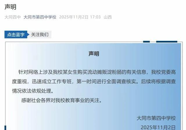 学校传递“拔钥匙”事务进展 查询拜访启动激发热议!大同四中一名女生正在采办淀粉肠时被校方工做人员拔走钥匙,此事激发普遍关心。校方已成立“工做专班”对此事进行查询拜访,并暗示将依法依规处置。