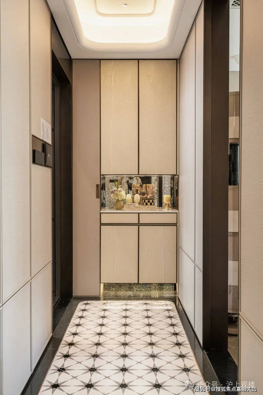 入户石材拼花:玄关地面以三种天然石材手工拼花工艺打制,通过材质肌理的碰撞取几何纹样的对称,营制媲美五星级酒店大堂的典礼感,材质品级对标顶豪项目。